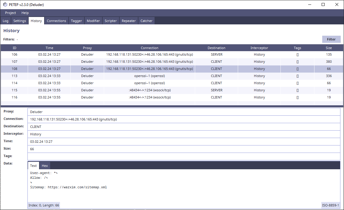 deluder attach -c config.json "Application.exe"In order to use Deluder with graphical interface, you can use PETEP (PEnetration TEsting Proxy), which supports integration with Deluder and allows you to conveniently work with the intercepted data.