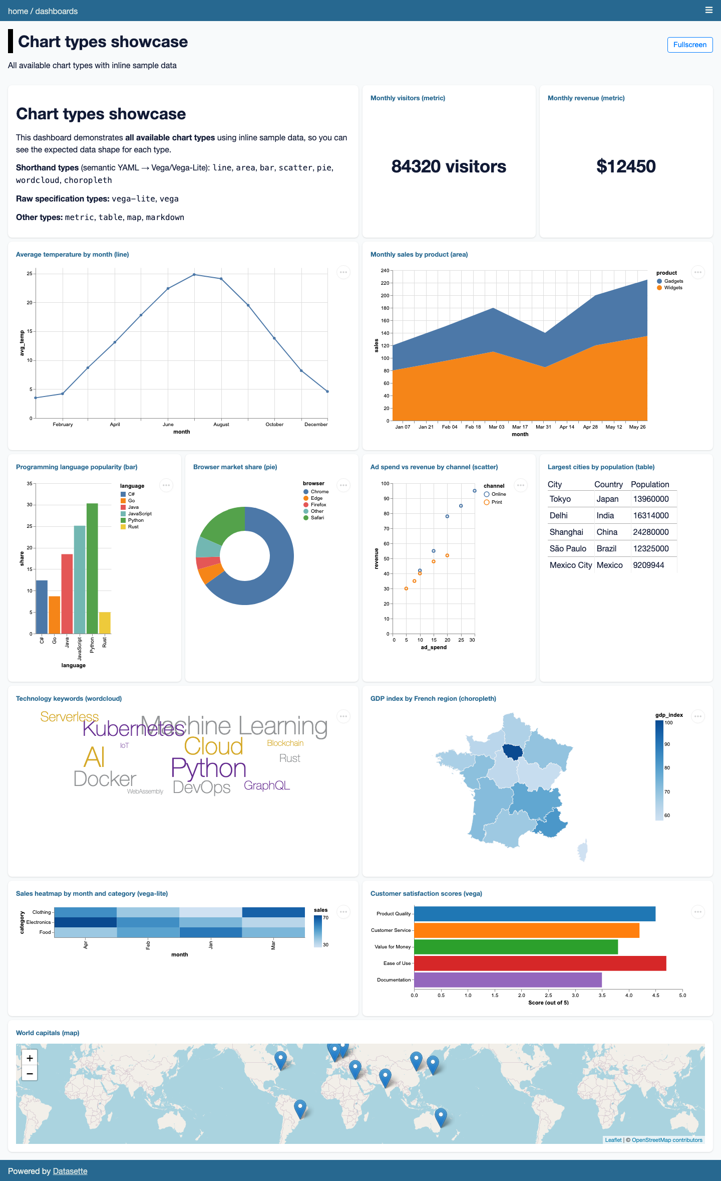 $ datasette install datasette-dashboardsDefine dashboards within metadata.yml / metadata.json: