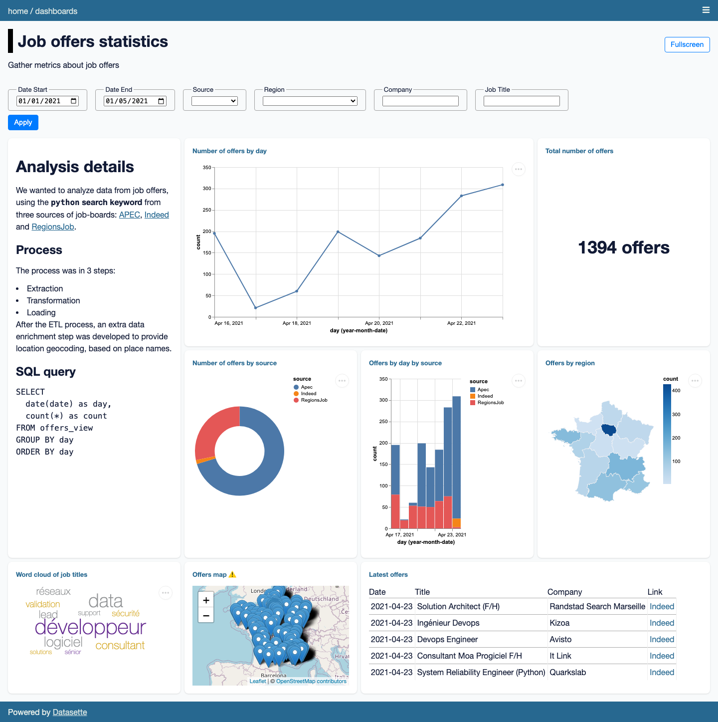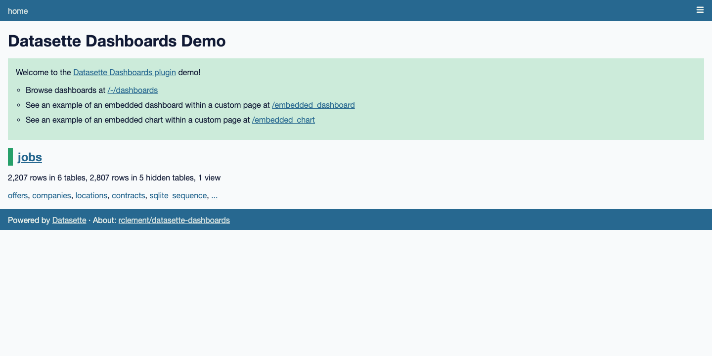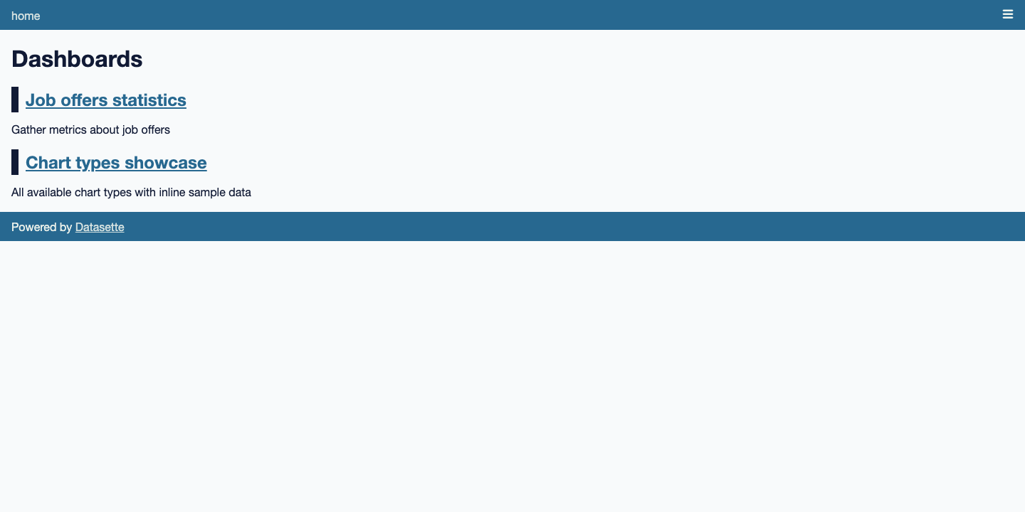 The Datasette Dashboards plugin allows to create interactive data visualisation dashboards in a declarative manner using the Datasette metadata configuration file. Coupled with a version control system such as Git, it transforms you Datasette instance into a BI as Code (Business Intelligence as Code) tool.
